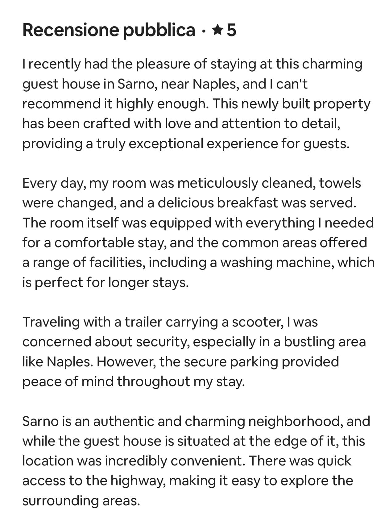 A pochi passi, nel centro storico di Sarno potrete trovare negozi, ristorantini autentici e bar, dove respirare la vera vita sarnese. La fermata dell’autobus accanto alla struttura e le stazioni ferroviarie a una decina di minuti a piedi rendono gli spostamenti comodi e veloci, anche senza automobile.